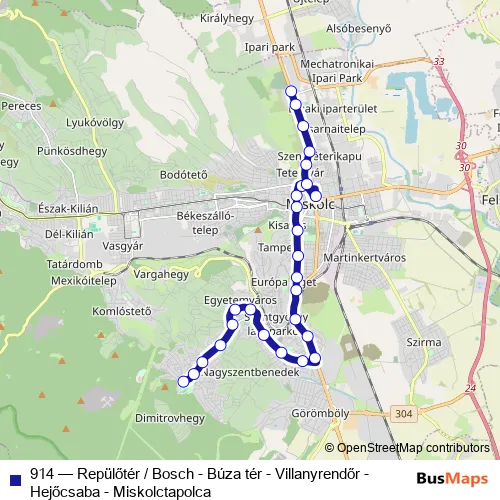The first stop of the 914 bus route is Miskolctapolca and the last stop is Repülőtér / Bosch. 914 (Repülőtér / Bosch - Búza tér - Villanyrendőr - Hejőcsaba - Miskolctapolca) is operational during everyday.