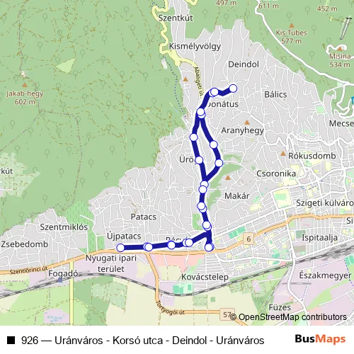 The first stop of the 926 bus route is Uránváros and the last stop is Uránváros. 926 (Uránváros - Korsó utca - Deindol - Uránváros) is operational during everyday.
