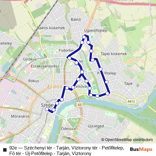 Bus 92e - Széchenyi tér - Tarján, Víztorony tér - Petőfitelep, Fő tér - Új-Petőfitelep - Tarján, Víztorony: Full Schedule in Szeged