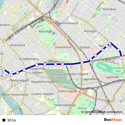 The first stop of the 931a bus route is Deák Ferenc tér M and the last stop is Örs vezér tere M+H. 931a is operational during everyday.