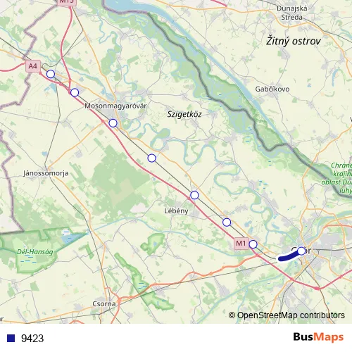 The first stop of the 9423 rail route is Hegyeshalom and the last stop is Győr. 9423 is operational during on weekdays.