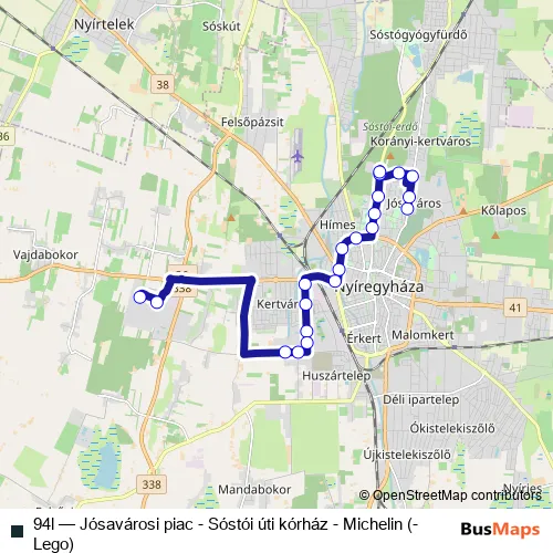 Click here to view the nearest 94l - Jósavárosi piac - Sóstói úti kórház - Michelin (- Lego) bus stop.