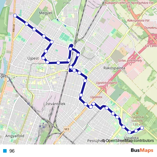 The first stop of the 96 bus route is Fóti út and the last stop is Újpalota, Szentmihályi út. 96 is operational during everyday.