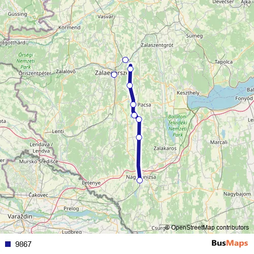 The first stop of the 9867 rail route is Nagykanizsa and the last stop is Zalaegerszeg. 9867 is operational during everyday.