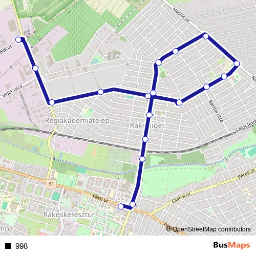 The first stop of the 998 bus route is Rákoskeresztúr, városközpont and the last stop is Cinkotai autóbuszgarázs. 998 is operational during everyday.