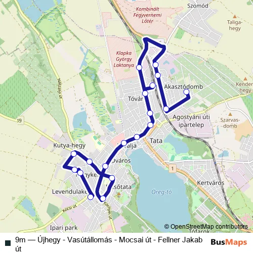 The first stop of the 9m bus route is Tata, Újhegy, buszforduló and the last stop is Tata, Fellner Jakab utca. 9m (Újhegy - Vasútállomás - Mocsai út - Fellner Jakab út) is operational during everyday.