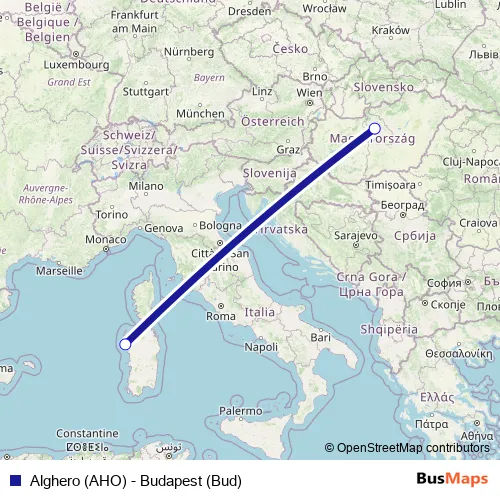 Alghero (AHO) - Budapest (Bud) air Route Map