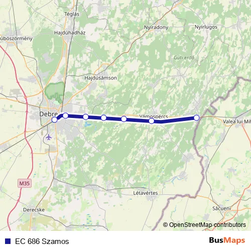 The first stop of the EC 686 Szamos rail route is Debrecen and the last stop is Nyírábrány. EC 686 Szamos (EC 686 Szamos) is operational during everyday.