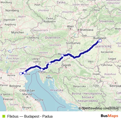 The first stop of the Flixbus bus route is Padua Via Fra' Paolo Sarpi and the last stop is Budapest Nepliget. Flixbus (Budapest - Padua) is operational during everyday.