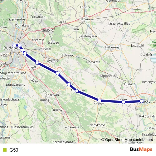 The first stop of the G50 rail route is Szolnok and the last stop is Budapest-Nyugati. G50 is operational during on weekdays.
