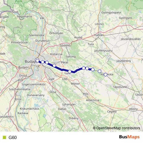 The first stop of the G60 rail route is Budapest-Keleti and the last stop is Nagykáta. G60 is operational during on weekdays.