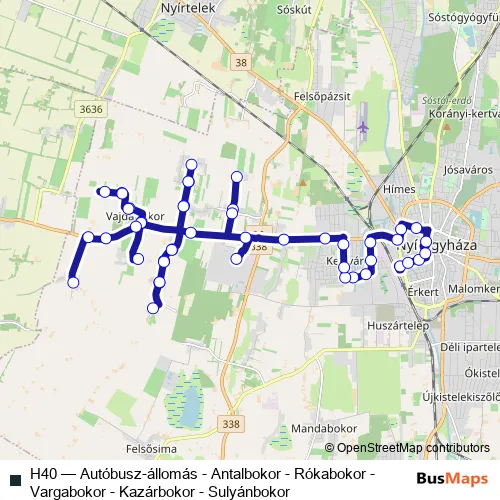 The first stop of the H40 bus route is Nyíregyháza, autóbusz-állomás and the last stop is Nyíregyháza, Sulyánbokor autóbusz-forduló. H40 (Autóbusz-állomás - Antalbokor - Rókabokor - Vargabokor - Kazárbokor - Sulyánbokor) is operational during everyday.