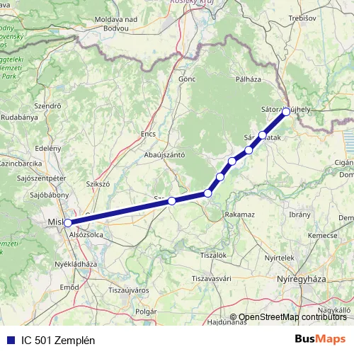 The first stop of the IC 501 Zemplén rail route is Sátoraljaújhely and the last stop is Miskolc-Tiszai. IC 501 Zemplén (IC 501 Zemplén) is operational during everyday.