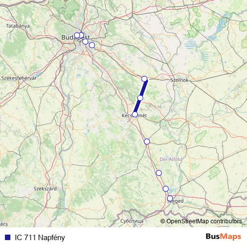 The first stop of the IC 711 Napfény rail route is Kiskundorozsma and the last stop is Budapest-Nyugati. IC 711 Napfény (IC 711 Napfény) is operational during everyday.