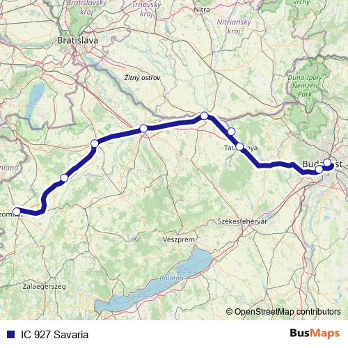 The first stop of the IC 927 Savaria rail route is Szombathely and the last stop is Budapest-Keleti. IC 927 Savaria (IC 927 Savaria) is operational during everyday.