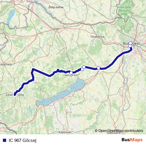 The first stop of the IC 967 Göcsej rail route is Veszprém and the last stop is Budapest-Déli. IC 967 Göcsej (IC 967 Göcsej) is operational during everyday.