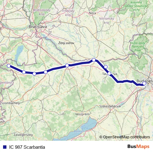 The first stop of the IC 987 Scarbantia rail route is Sopron and the last stop is Budapest-Kelenföld. IC 987 Scarbantia (IC 987 Scarbantia) is operational during everyday.