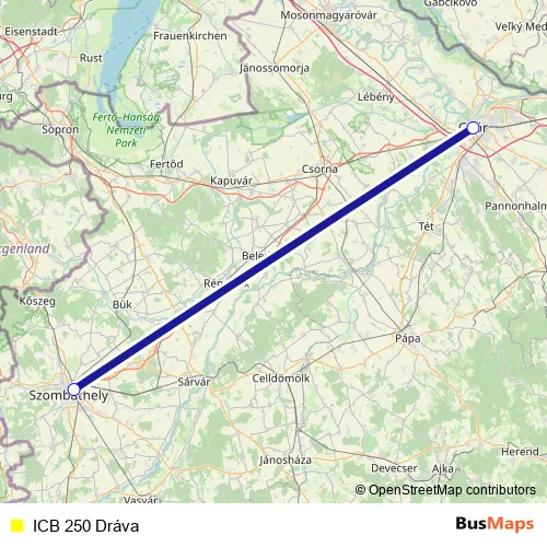 The first stop of the ICB 250 Dráva bus route is Győr and the last stop is Szombathely. ICB 250 Dráva (ICB 250 Dráva) is operational during everyday.