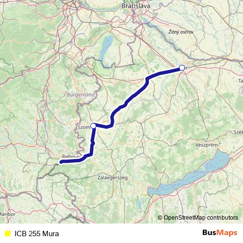 The first stop of the ICB 255 Mura bus route is Szombathely and the last stop is Győr. ICB 255 Mura is operational during everyday.