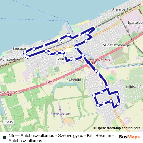 The first stop of the N5 bus route is Siófok, autóbusz-állomás and the last stop is Siófok, autóbusz-állomás. N5 (Autóbusz-állomás - Szépvölgyi u. - Kiliti,Béke tér - Autóbusz-állomás) is operational during on weekends.