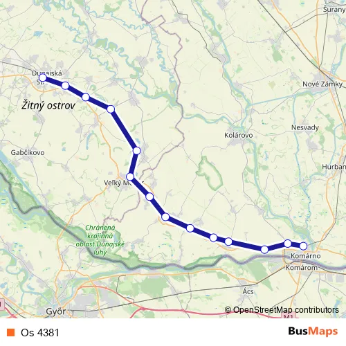 The first stop of the Os 4381 rail route is Dunajská Streda and the last stop is Komárno. Os 4381 is operational during on weekdays.