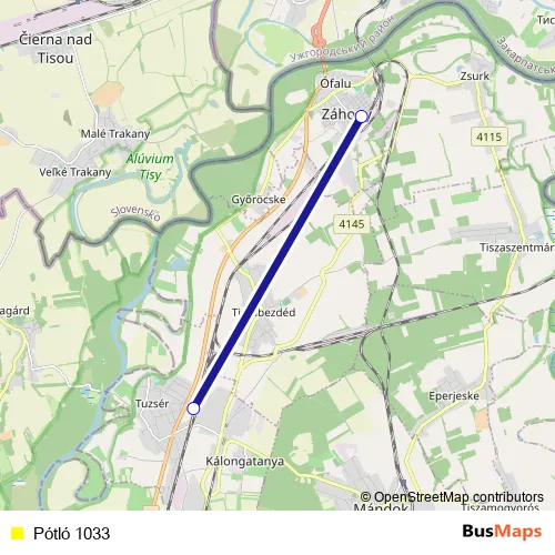 The first stop of the Pótló 1033 bus route is Záhony and the last stop is Tuzsér. Pótló 1033 is operational during on weekdays.