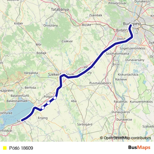The first stop of the Pótló 18609 bus route is Lepsény and the last stop is Kiscséripuszta. Pótló 18609 is operational during everyday.