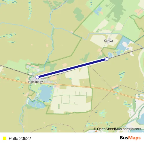 The first stop of the Pótló 20622 bus route is Kónya and the last stop is Hortobágy. Pótló 20622 is operational during on weekdays.
