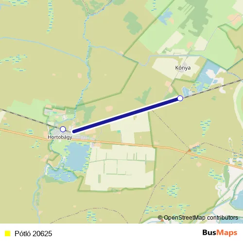 The first stop of the Pótló 20625 bus route is Hortobágy and the last stop is Kónya. Pótló 20625 is operational during on weekdays.