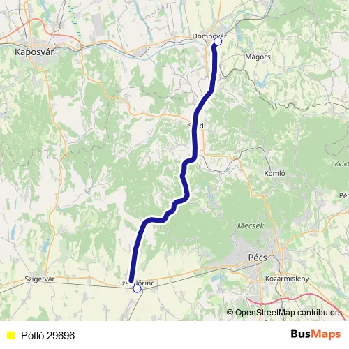 The first stop of the Pótló 29696 bus route is Szentlőrinc and the last stop is Dombóvár. Pótló 29696 is operational during everyday.