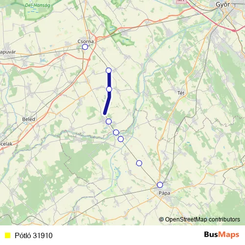 The first stop of the Pótló 31910 bus route is Pápa and the last stop is Csorna. Pótló 31910 is operational during everyday.