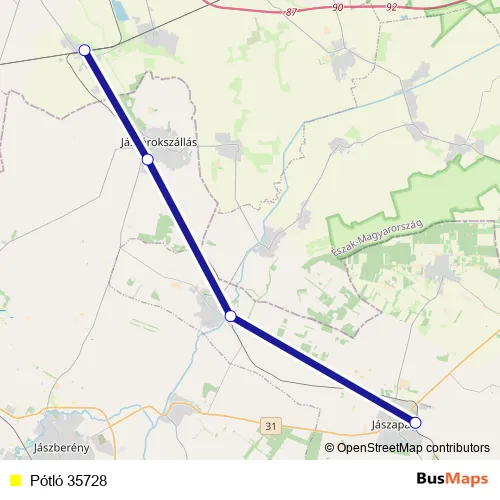 The first stop of the Pótló 35728 bus route is Vámosgyörk and the last stop is Jászapáti. Pótló 35728 is operational during everyday.