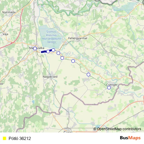 The first stop of the Pótló 36212 bus route is Mátészalka and the last stop is