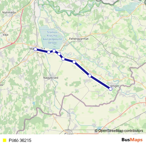 The first stop of the Pótló 36215 bus route is Csenger and the last stop is Mátészalka. Pótló 36215 is operational during everyday.