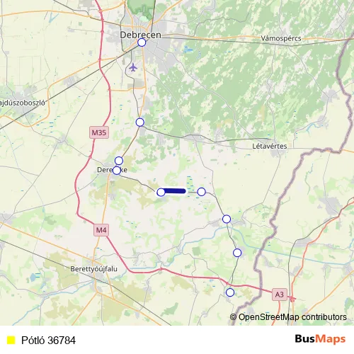 The first stop of the Pótló 36784 bus route is Debrecen and the last stop is Nagykereki. Pótló 36784 is operational during on weekdays.