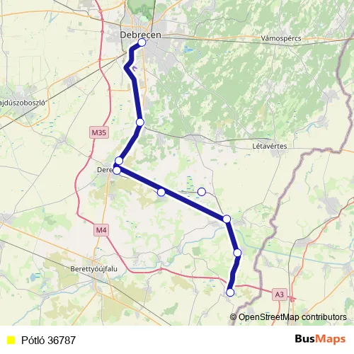 The first stop of the Pótló 36787 bus route is Nagykereki and the last stop is Debrecen. Pótló 36787 is operational during on weekdays.
