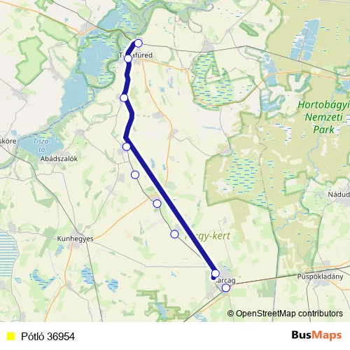 The first stop of the Pótló 36954 bus route is Karcag and the last stop is Tiszafüred. Pótló 36954 is operational during everyday.