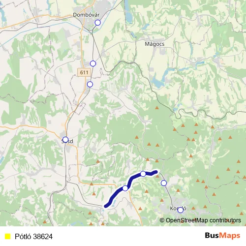 The first stop of the Pótló 38624 bus route is Dombóvár and the last stop is Komló. Pótló 38624 is operational during everyday.