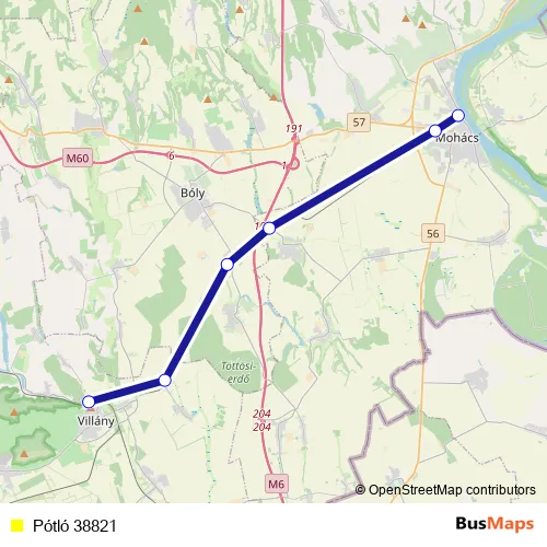 The first stop of the Pótló 38821 bus route is Mohács and the last stop is Villány. Pótló 38821 is operational during everyday.