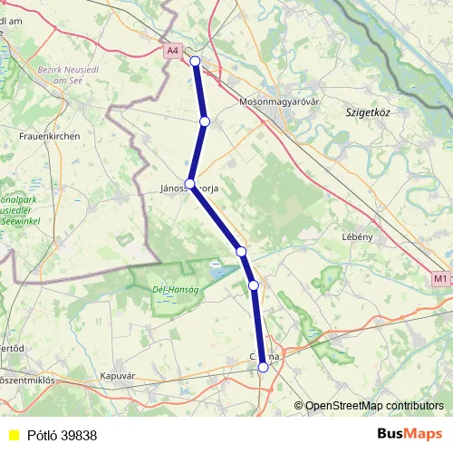 The first stop of the Pótló 39838 bus route is Hegyeshalom and the last stop is