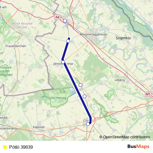 The first stop of the Pótló 39839 bus route is Csorna and the last stop is Hegyeshalom. Pótló 39839 is operational during everyday.