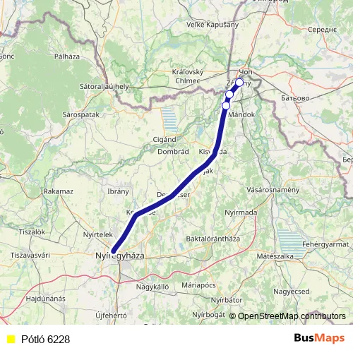 The first stop of the Pótló 6228 bus route is Tuzsér and the last stop is Záhony. Pótló 6228 is operational during everyday.