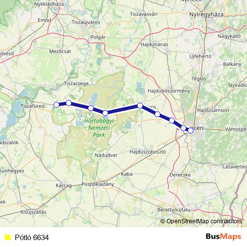 The first stop of the Pótló 6634 bus route is Debrecen and the last stop is Egyek. Pótló 6634 is operational during everyday.