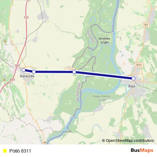The first stop of the Pótló 8311 bus route is Baja and the last stop is Bátaszék. Pótló 8311 is operational during everyday.
