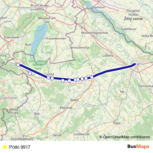 The first stop of the Pótló 9917 bus route is Sopron and the last stop is Csorna. Pótló 9917 is operational during everyday.