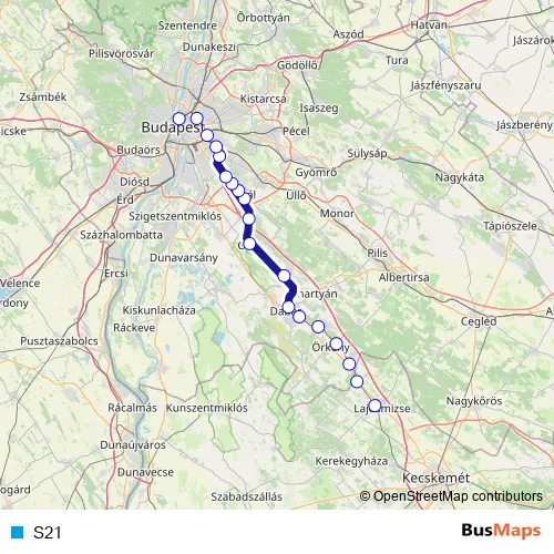 The first stop of the S21 rail route is Lajosmizse and the last stop is Budapest-Nyugati. S21 is operational during everyday.