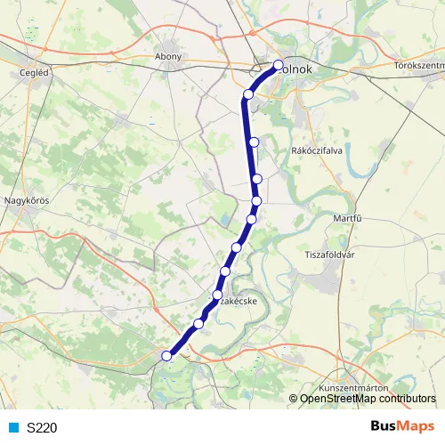 The first stop of the S220 rail route is Lakitelek and the last stop is Szolnok. S220 is operational during everyday.