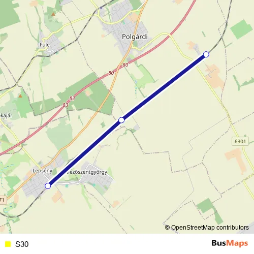 The first stop of the S30 bus route is Kiscséripuszta and the last stop is Lepsény. S30 is operational during everyday.
