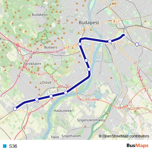 The first stop of the S36 rail route is Tárnok and the last stop is Kőbánya-Kispest. S36 is operational during everyday.