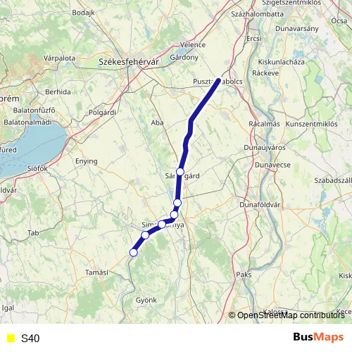 The first stop of the S40 bus route is Pincehely and the last stop is Sárbogárd. S40 is operational during everyday.